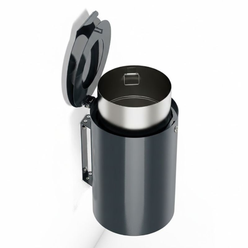Papperskorgen kan enkelt monteras på en vägg med hjälp av ett väggfäste och skruvar.